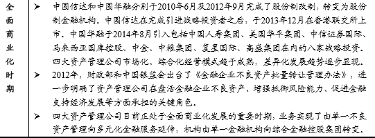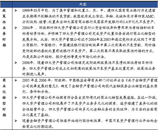 我国的四大资产管理公司的发展经历了三个阶段:1999年-2005年的政策性业务时期、2006-2010年的商业化转型时期和2010年至今的全面商业化时期。