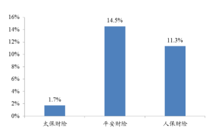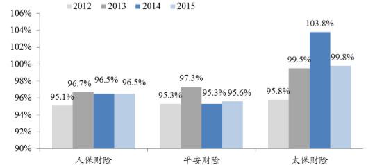 2015年财险保费实现稳步增长,主要来源仍是车险。其中人保/平安/太保保费同比增长11.3%/14.5%/1.7%。太保在经历了2014年的承保亏损后改变战略,注重风险选择和成本管控,保费增幅较小。