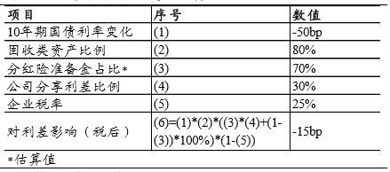 2014年以来市场利率持续下行,由于负债端的存量保单有保证利率,负债端资金成本不会立刻随着利率相应下降,而投资端利息类收益下降将会挤压利差空间,对短期利润造成一定压力。假设大型公司的利差(税后)在100bp左右,根据我们的测算,10年期国债收益率(目前2.8%)下降50bp对利差(税后)的影响约为-15bp,利差空间收窄至原先的85%。