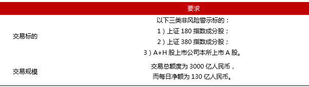 目前沪港通已经明确了交易标的和交易规模,其中沪股通的交易标的主要有以下三类非实施了风险警示的股票:1)上证180指数成分股;2)上证380指数成分股;3)A+H股上市公司本所上市A股。在交易规模上,沪股通的交易总额度为3000亿人民币,而每日净额为130亿人民币。