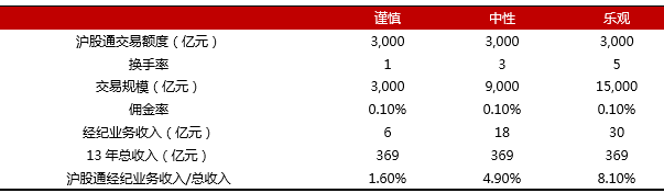 由于香港本地券商的经纪业务占比较高、香港市场的交易规模远低于国内以及沪股通的规模大于港股通三个原因,预计沪港通开通后对于香港证券公司的收入弹性将显著高于内地证券公司。中性假设下来看,我们认为沪股通对于香港证券行业的弹性将达到5%。