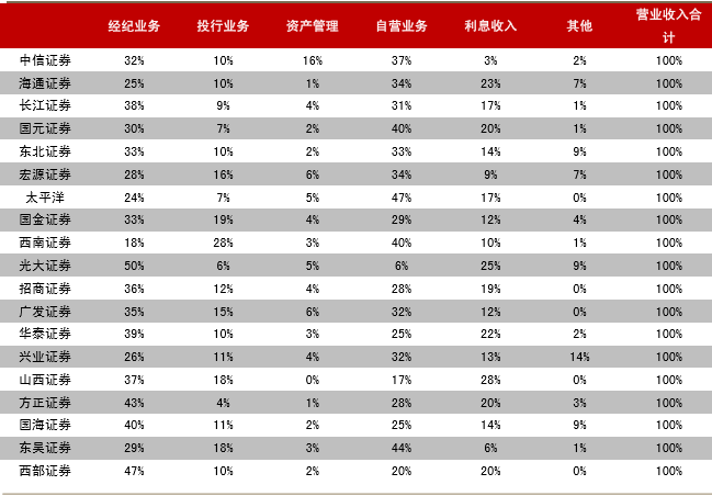 经纪业务收入占比显著下滑,投行、自营收入上升