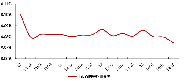 随着国金证券、华泰证券开始实行低佣金的网络券商战略,上市券商整体净佣金率在14年出现了显著下滑,上市券商经纪业务的佣金率水平(剔除并表的中信证券)为万分之7,比13年同期下滑了12.4%。随着网络券商战略的推进,预计佣金率下滑的趋势将比较确定。