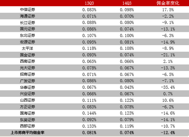 从上市券商的角度来看,市场份额上升最快的华泰证券,佣金率下滑幅度达到35%,为上市券商佣金率下滑最高的券商。