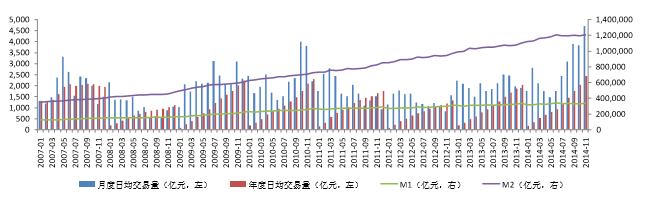 参考上一波牛市,月度日均交易量的顶点是07年5月,当时日均交易量达到3323亿,07年全年的日均交易量达到1939亿。但与当时相比,我国目前的M2为121万亿,是07年4月36.7万亿的3.3倍;活化资金M1为33.5万亿,是07年4月的12.8万亿2.6倍。因此,在目前流动性驱动的牛市逻辑没有发生变化的情况下,此次月度日均交易量的顶峰应为1万亿(按照07年月度日均的顶峰值的3倍测算),全年的日均交易量为5800亿左右(按照07年全年日均的3倍测算)。