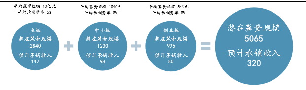 按目前排队情况,我们测算潜在IPO募资规模预计将达到5065亿元,按照主板平均承销费率5%,中小板、创业板平均费率8%,我们匡算将为券商带来320亿元的承销收入。