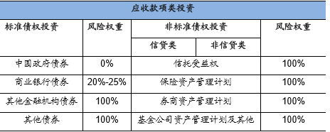 根据2014年五部委联合发布的《关于规范金融机构同业业务的通知》(银发[2014]127号)的要求,应收款项类投资下明细项目根据所投资基础资产的性质,准确计量风险并计提相应资本与拨备。依照银监会2012年发布的《商业银行资本管理办法(试行)》,具体各项风险权重如下: