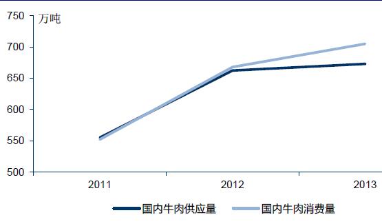 第二阶段(2012.01-2013.12):需求快速上升,牛肉价格大幅上涨。自2011年下半年开始,牛肉价格进入了快速上升通道。2012年1月到2013年12月,牛肉价格由40.51元/公斤增长到63.01元/公斤,涨幅达到55.5%。快速上涨的过程中牛肉的春节效应也有所体现,主要仍表现为每年1-2月份会出现一次价格“凸点”。此次牛肉价格快速上涨主要是由于国内牛肉需求快速爆发所引起的,2011-2013年国内牛肉消费量从552万吨增长至705万吨,增长27.7%,同期国内牛肉总供应量增长21.2%,由2011年的555万吨增长到2013年的673万吨。国内牛肉需求快速增加是牛肉价格快速上涨的主要原因。在此阶段内,牛肉需求上升主要由两方面因素引发:购买能力和购买意愿。购买能力主要由消费能力(人均可支配收入)决定,2011-2013年我国人均可支配收入由14581.9元增长至18310元,增长25.56%,极大的提升了居民的购物能力与购物需求;购买意愿主要是受消费结构升级影响,2011年牛肉消费占总体肉类消费量8.08%,2013年增长到9.32%,显示出了较为明显的消费结构升级迹象。总体来看,第二阶段的牛肉价格快速上涨主要原因是人均可支配收入快速提高以及消费机构升级加快所导致的需求上升所引起的。第二阶段(2012.01-2013.12)牛肉价格变化