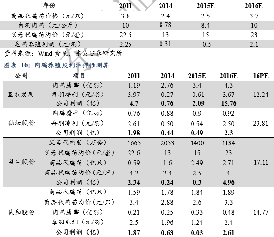 行业利润弹性空间巨大。随着行业步入景气周期,行业盈利将大幅上升。毛鸡养殖利润在行业最景气达5.23元/羽,较目前-4.12元/羽存在巨大改善空间。预计2015、2016年白羽肉鸡年平均价格分别上涨-4.3%、19%,2015年行业利润整体大概率亏损,但是2016年有望快速恢复到2011年的水平。