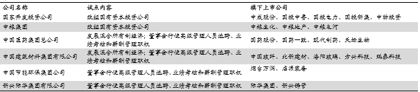 2014年国资委选择了6家中央企业作为改革试点企业,分别是国家开发投资公司、中粮集团、中国医药集团总公司、中国建筑材料集团有限公司、中国节能环保集团公司、新兴际华集团有限公司。此外,还选择2到3家开展派驻纪检组试点。为了探索国企改革的新路子、新方法,实行试点先行,同步推进改革落地,目前这6家央企的改革已经有所进展。中纺投资被安信证券借壳,成为国投旗下金融产业运作平台,洛阳玻璃和中建材集团控股股东进行资产臵换,国投中鲁资产重组虽因客观原因未能成功,但未来继续产业转型的概率仍然较大。