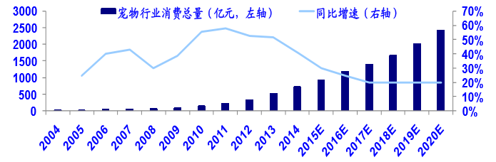 2004-2014国内宠物行业总规模与同比增速(预测至2020年)