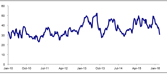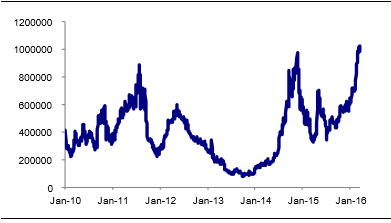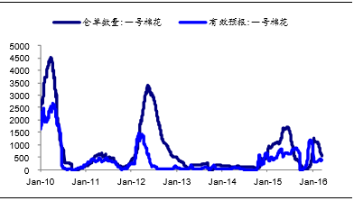 截止2016年3月21日,郑商所棉花仓单为531张,与超过100万手的持仓量形成了鲜明对比。仓单棉一方面数量不多且存放不够集中,给企业可选择的空间较小,也不能大规模批量采购;另一方面,性价比高的仓单棉大部分已经流出,剩余的高升水的棉花性价比并不具备优势。因此,期货仓单并没有明显的价格优势,下游采购现货的性价比更高,这将对棉花期价未来的反弹空间形成压制,但反弹的节奏依旧将存在。