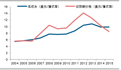 2004—2015年间仅有两次美国大豆收割期价格跌破大豆成本,而中国仅在2014年大豆平均价格跌破总成本,主要是因为2014年中国取消大豆临储政策,从而导致国内大豆价格不断下跌并跌破成本线。在价格景气的2012年,中美大豆价格超过成本的幅度分别为22%和36%。