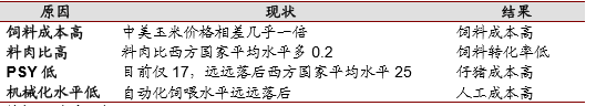 代表国际平均水平的育肥猪饲料转化率为2.6:1,而我国目前约为2.8:1(十三五规划到2020年料肉比达到2.7:1),与发达国家相差并不明显。料肉比的差距来自于以下几个方面:首先是猪的品种,另外是饲料配方、饲养环境、饲养技术等其他因素。