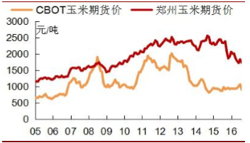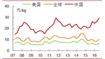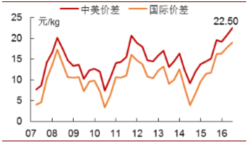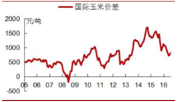 饲料成本占养殖成本的70%左右,饲料成本中约60%是玉米。中美玉米价格差异非常大,一方面源于政府的临储政策推升国内玉米价格,此外,美国现代化的农业生产成本较低,一正一负造成价差目前高达830元/吨,美国玉米价格几乎只有国内的一半,是造成养殖成本差异的最主要原因。