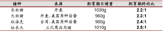 猪种:丹麦系的猪种料肉比最低,我们常见的杜长大三元猪的祖先长白猪的育肥期料肉比可达到2.2:1,丹麦系的日增重也是最快的。值得骄傲的是温氏的四元猪也达到了2.4:1的料肉比水平。