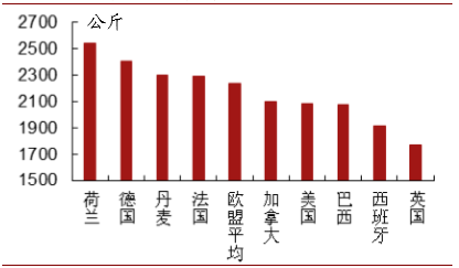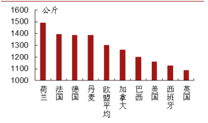 各国每头母猪年生产猪肉酮体量对比
