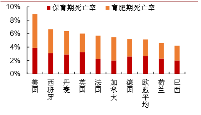 各国保育和育肥两阶段死亡率对比