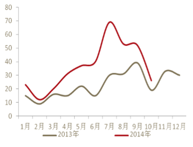 中国国际招标信息网数据显示2014年各月份土地确权发标数量较2013年有显著增加,尤其是2014年7、8两月招标数量达到2013年同期的2倍左右,截止到2014年10月当年总计招标合同个数达到363个,较2013年211个增长74%,金额约增长100%。