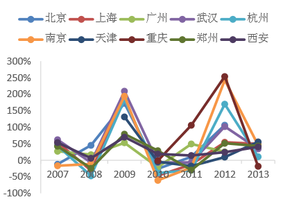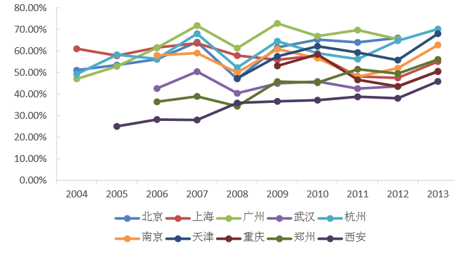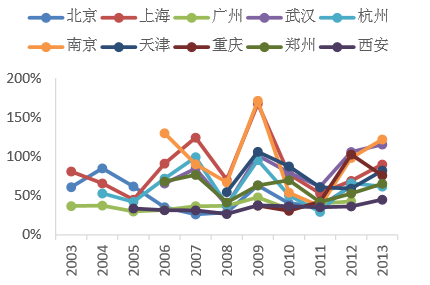 个人住房贷款发放与房地产市场形势紧密相关。同一城市每年发放贷款的金额波动较大,占归集金额的比重波动也较大,销量高的年份占比较大。如2009年上海和南京发放个人住房贷款金额与当年公积金归集金额的比值分别达到167%和171%,而在2010年迅速回落至78%和54%。