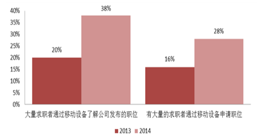据领英调查数据显示,2014年求职者通过使用移动设备获取职位信息,投递职位申请的比例相较于2013年有明显上升。目前,由PC端转移和移动端新增的用户体量较小,未来有比较大的增长空间。