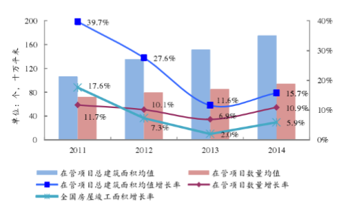 近年来,随着我国新型城镇化的推进以及中国房地产市场快速发展,存量房市场规模日益增大,为物业服务企业提供了巨大的发展空间。2014年,全国商品房竣工面积为10.7亿平方米,存量房市场规模再创新高。根据近3年年均复合增长率计算,全国未来3年物业管理市场容量将新增35亿平方米的规模,为物业服务企业发展提供广阔的空间。以百强企业为代表,根据中国指数研究院发布的《2015中国物业服务百强企业研究报告》,2014年,中国物业服务百强企业在管项目总建筑面积均值为1749万平方米,同比增长15.7%,在管项目数量均值为94个,较上年增加9个,同比增长10.9%,百强企业发展规模呈现提速增长态势。