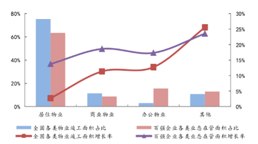 从具体业态来看,以百强企业为代表,居住物业服务在管面积均值为1105.3万平方米,同比增长13.7%,仍是物业企业最主要的物业服务类型;商业物业和办公物业在管面积分别为148.7万平方米和271.1万平方米,同比增长18.6%和17.3%,商办物业增速明显加快。另外,受我国社会经济转型升级以及产业结构调整的积极影响,公共物业与工业物业也成为物业管理企业重要的业务发展领域。
