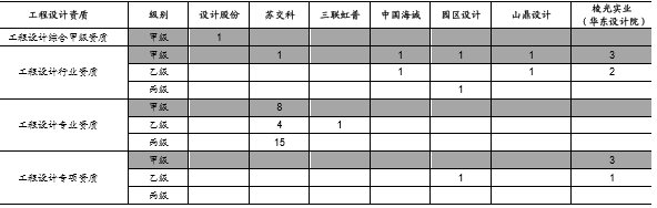 工程咨询行业中,资质决定了企业未来项目承接能力。根据《建设工程勘察设计管理条例》和《建设工程勘察设计资质管理规定》,将行业资质分为四类:工程设计综合资质(甲级)、工程设计行业资质(甲乙丙级)、工程设计专业资质(甲乙丙级)以及工程设计专项资质。其中工程设计综合甲级资质是我国工程设计资质等级最高的,可承接全部21个行业的所有工程设计业务,目前A股上市工程咨询企业中,仅设计股份2014年取得该资质。