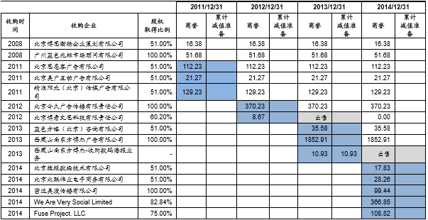 蓝色光标非同一控制下子公司商誉与累计商誉减值准备(百万元人民币)