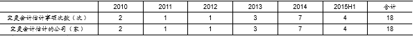 2010-2015H1变更会计估计共涉及15家上市公司,其中北新路桥(2010、2011)、四川路桥(2014、2015)以及中国电建(2014、2015)分别有两次会计估计变更事项。