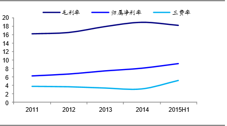 2011-2015H1亚厦股份毛利率和三费率情况(%)