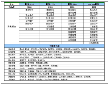 财务软件的功能模块的划分并不是统一,主要由软件提供商根据软件设计的思路自行决定。如有些财务软件将其中的采购、库存、销售、客户系统合并成为进销存系统。并非所有的财务软件都包含全部的功能模块,不同品牌和同一品牌不同型号的财务软件之间功能模块的组合和设计一般不相同。但无论财务软件的功能如何组合,总账模块一般都是财务软件的核心,大部分其他模块会将自身的汇总数据传输给总账模块。