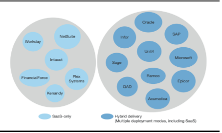 随着SaaSERP的接受程度不断提高,新兴的SaaSERP厂商,如Acumatica、Netsuite、PlexSystems、Ramco和Workday等厂商成长非常迅速。其中Netsuite、PlexSystems和Workday都只提供SaaS版本的ERP。