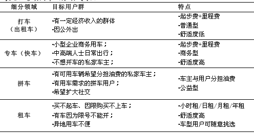 移动用车市场主要包含打车(出租车)、专车、拼车及租车等不同服务模式,不同细分市场的目标用户有所差异,打车软件主要针对普通人群,解决了出租车司机与乘客的信息不对称问题,用户覆盖面较广;专车主要针对的是中高端商务人群,价格比出租车要高20%-30%;拼车主要针对有上下班乘车需求的普通白领人群,价格比出租车要低;租车主要针对没有车、限号无法开车、异地用车等人群,提供车辆对外出租服务。