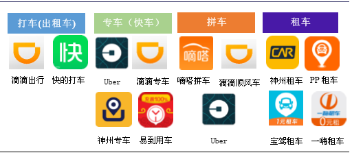 研究报告各个细分领域都有典型应用,发展势头良好。目前,打车(出租车)应用被滴滴快的打车所垄断,市场份额在98%左右;专车(快车)领域主要参与者为滴滴专车、Uber、神州专车、易到用车;拼车领域主要为滴滴顺风车、嘀嗒拼车、Uber;租车领域有B2C模式的神州租车、一嗨租车,以及C2C模式的宝驾租车、PP租车。