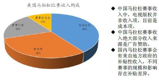 马拉松赛事收入来源主要包括转播权、赞助收入、报名收入和纪念品收入四部分。国外马拉松赛事转播收入占比高达40%,而国内马拉松赛事的收入来源主要是商业赞助,除商业赞助之外,还包括政府补贴和参赛选手的报名费收入。我们认为,短期来看,中国马拉松通过转播赛事获得收入的可能性不大,原因在于马拉松赛事本身的观赏性有待继续开发;国内对于马拉松参与热情高涨,但是对于通过转播观看马拉松赛事并没有观看其他职业赛事更有兴趣,即通过观看马拉松赛事转播用户体验不好,由此带来的低收视率直接导致电视媒体对于马拉松的转播市场热情不高,从而使得电视转播不仅不能成为马拉松赛事的收入项,反而成为很多赛事的成本项。长期来看,国内民众更加关注健康和运动,同时赛事运作水平不断提升,国内马拉松赛事收入结构会向国外趋同,转播权收入、赞助收入以及报名收入渐趋合理。
