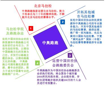 中奥路跑(北京)体育管理有限公司作为北京马拉松的承办机构,是中体产业的孙公司,是由中国田径协会与中奥体育产业有限公司(中体产业子公司)合资成立的专业路跑推广公司,中国田径协会和中奥体育双方各占50%股份。中奥路跑主要有四个核心业务:独家运营国际田联金标马拉松赛事北京马拉松;开展、运营、推广、服务中国其他城市马拉松赛事;运营中国田径协会路跑委员会;开设马拉松学院以及发行路跑杂志。相对于智美体育的民营背景,中奥路跑作为中国田径协会和中奥体育组建的公司,具有纯正的国企背景,其中中奥体育是上市公司中体产业的子公司,而中体产业是国家体育总局唯一的上市公司平台。中奥路跑公司的股东背景
