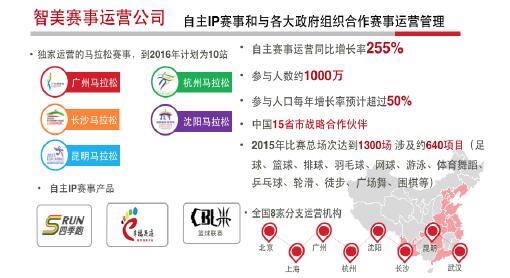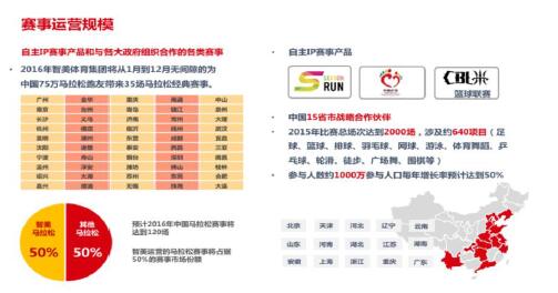 智美体育、中奥路跑、东浩兰生是马拉松赛事运营的专业机构。智美体育作为港股上市公司,是一家专业的赛事运营机构。智美作为中国第一家上市的体育文化产业整体运营商,业务覆盖跑步、篮球、冬季运动等领域,与多省市体育主管部门形成战略合作。从2016年开始,智美全面推行2016-2019年马拉松全产业发展战略,重点打造国际IP赛事、国家级IP赛事、城市级IP赛事及娱乐IP赛事。2016年上半年举办了2016昆明高原国际半马拉松赛、2016海南国际马拉松赛、2016东莞松山湖国际马拉松赛、2016吉林市国际马拉松赛和2016天津马拉松赛。通过调研和访谈,马拉松赛事运营的准备周期一般在6个月左右,大型赛事筹备周期通常超过半年时间,政策上支持群众性和商业性赛事的举办,但是需要协调的部门至少十几家,涉及到交通、医疗卫生、安保、媒体宣传等等各个环节,智美体育的成功赛事运营反映出随着中国路跑赛事的增多,运作马拉松赛事的机构必将专业化,并朝着规模化发展。智美体育实际赛事运作数据和未来发展目标