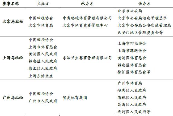 官方主办,专业赛事公司承办,是目前国内马拉松赛事的一般运作模式。目前国内比较有影响力的马拉松赛事有北京马拉松、上海马拉松、厦门马拉松、扬州马拉松以及广州马拉松等赛事,运作马拉松赛事的机构具备专业赛事运营能力。随着马拉松赛事如火如荼,相关的赛事运营公司也应运而生,未来随着赛事的规模扩大和赛事的不断完善,专业赛事运营机构的机会和空间持续放大。以北京马拉松、上海马拉松和广州马拉松为例,对赛事举办方、承办方和合作方各方背景分析可以看出,目前马拉松赛事的举办仍然以官方主导,但是专业机构在赛事运作过程中大有可为。按照《关于推进体育赛事审批制度改革的若干意见》要求,全国性和国际性的重大赛事仍然要有官方备案和审批,从赛事众多赛事协办方的背景看,举办一场马拉松尤其是全国性和国际性的大型马拉松赛事不可能缺少政府公共作用的支持,专业的承办方和赛事运营结构必须协调各方才能保证赛事质量和水平。