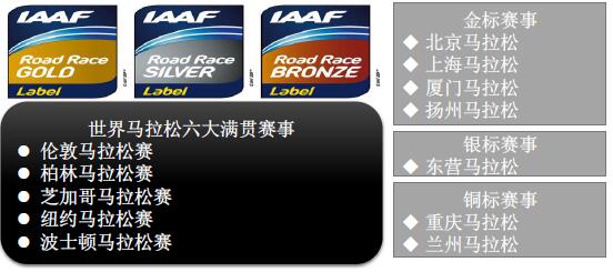 按照国际田联的认证标准,马拉松赛事分为金标赛事、银标赛事和铜标赛事,一般的划分标准是比赛水平(高水平运动员人数和参赛国家选手人数)、全封闭赛道、电视转播、比赛成绩及时公告、赛道饮水补给、获得名次选手兴奋剂检查等。马拉松赛事金标赛事比较著名的有世界马拉松六大满贯赛事,包括伦敦马拉松、柏林马拉松、芝加哥马拉松、纽约马拉松、波士顿马拉松和东京马拉松。国际田联路跑赛事不同级别