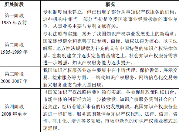 我国知识产权服务业发展的总体趋势大致分为四个阶段,具体情况如下: