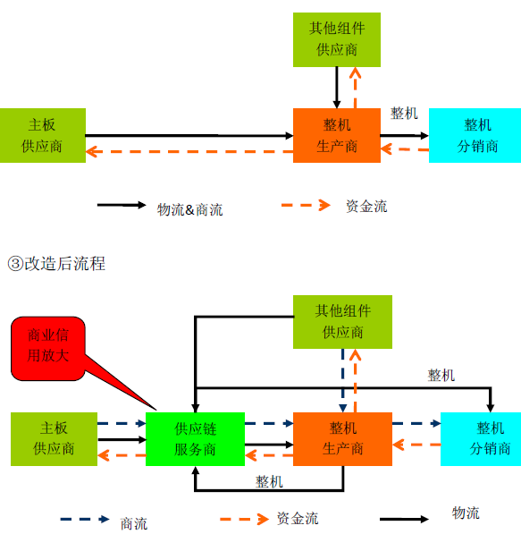 通过多流整合,将主板的采购和整机产成品的物流交给供应链服务商运作,同时改由主板供应商向供应链服务商提供信用额度,而再由供应链服务商向整机生产商提供一定规模的信用额度。在此安排下,供应链服务商通过控制库存主板和整机产成品的货物价值,得以给予整机生产商更大的信用额度。同时在不增加主板供应商应收款风险的情况下,整机生产商的商业信用得到了大幅放大,从而有效解决了整机生产商因资金不足而使其业务发展受限的问题。