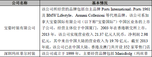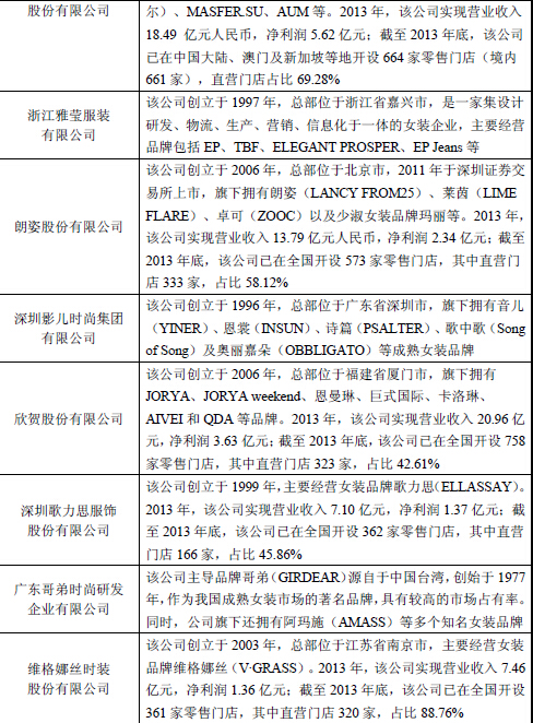 在中高档价格区间的国内成熟女装市场,女装品牌“玖姿”与“尹默”的主要竞争品牌包括宝姿(Ports)、玛丝菲尔(Marisfrolg)、雅莹(EP)、朗姿(LANCY)、音儿(YINER)、卓雅(YORYA)、哥弟(GIRDEAR)、阿玛施(AMASS)、例外(EXCEPTION)、维格娜丝(V·GRASS)及歌力思(ELLASSAY)等。各品牌与所属公司的简要情况如下: