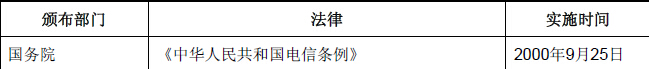 2000 年9 月25 日,国务院公布实施中华人民共和国国务院令(第291 号)《中华人民共和国电信条例》,条例规定国家对电信业务经营按照电信业务分类,实行许可制度。经营电信业务,必须依照本条例的规定取得国务院信息产业主管部门或者省、自治区、直辖市电信管理机构颁发的电信业务经营许可证。未取得电信业务经营许可证,任何组织或者个人不得从事电信业务经营活动。经营增值电信业务,业务覆盖范围在两个以上省、自治区、直辖市的,须经国务院信息产业主管部门审查批准,取得《跨地区增值电信业务经营许可证》。