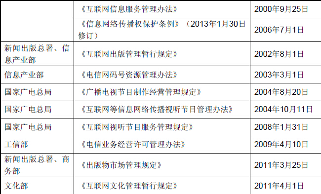 2011 年2 月17 日,文化部发布了《互联网文化管理暂行规定》(文化部51号令)。该规定明确了互联网文化产品的定义、行政许可期限、经营性互联网文化单位应具备的审批条件以及相应的罚则;明确了互联网文化产品是指通过互联网生产、传播和流通的文化产品,其中包括利用信息网络经营的音乐娱乐产品;明确了申请设立经营性互联网文化单位经批准后,核发《网络文化经营许可证》。