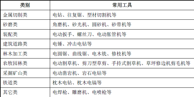 按照加工对象的不同,电动工具通常分为八大类:金属切削类工具、磨砂类工具、装配类工具、建筑道路类工具、林木加工类工具、农牧园林类工具、采掘矿山类工具、铁道类工具以及其它类工具,具体情况如下: