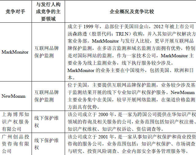 目前,在国内知识产权保护行业中,与上海新诤信完全类似的业务模式和服务组合的竞争对手较少。大多数竞争对手在知识产权保护服务的不同的服务环节和上海新诤信存在竞争,将上海新诤信的整体知识产权保护服务组合分为“互联网在线数据监测+线下维权执行”两个领域,分别列出其主要的行业竞争对手如下表所示。