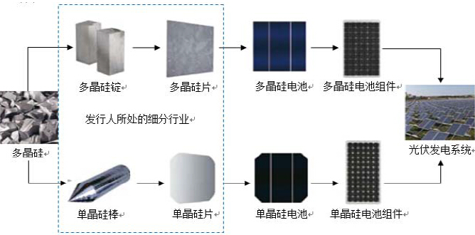 晶体硅太阳能光伏产业链主要包括多晶硅制造、硅锭(硅棒)生产及硅片切割、光伏电池制造、光伏组件封装、光伏发电系统建设等五个主要环节,如下图所示: