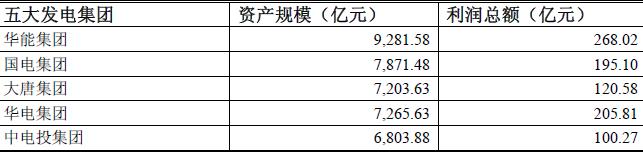 截至2014年底,国电投集团装机容量9,667万千瓦,其中,火电6,333万千瓦、水电1,925万千瓦、风电等其他能源1,263万千瓦。国电投集团拥有中国电力国际发展有限公司、中国电力新能源发展有限公司、上海电力股份有限公司、中电投远达环保(集团)股份有限公司、吉林电力股份有限公司、石家庄东方能源股份有限公司和内蒙古霍林河露天煤业股份有限公司等7家上市公司。五大发电集团2014年资产规模和利润总额情况如下表所示: