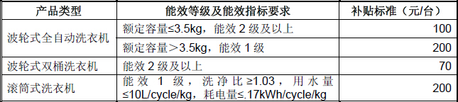 2012 年6 月4 日,财政部、国家发展改革委、工业和信息化部联合发布“关于印发《节能产品惠民工程高效节能电动洗衣机推广实施细则》的通知”(以下简称“细则”),实施“节能产品惠民工程”,推广期限暂定为2012 年6 月1 日至2013 年5 月31 日。根据细则,推广产品必须满足国家标准GB12021.4《电动洗衣机能耗限定值及能源效率等级》,补贴标准具体如下: